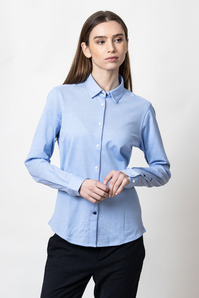 Indigo Bow 34 ser ut som en klassisk, vevd finskjorte – men er faktisk en strikket skjorte. Å ha på seg skjorten føles nærmest som å ha på seg en t-skjorte da den gir en utrolig komfort!