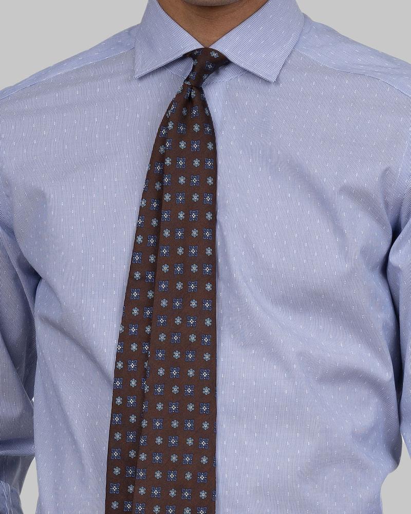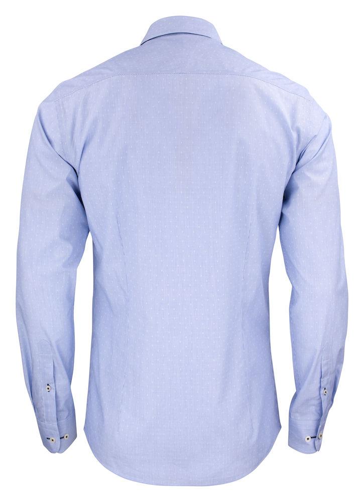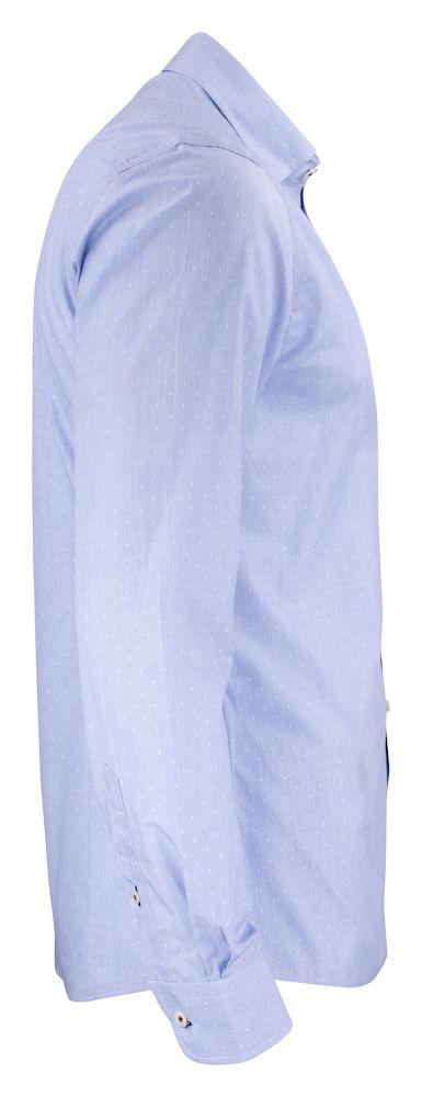 Et finstripet skyblått og lett dobbelt jacquardstoff, vevd med hvite prikker for å skape et moderne og sofistikert utseende. Kombineres flott med en dress eller sammen med jeans. Vårt nyutviklede stoff er laget med en mekanisk stretch som gir bedre komfort. Vårt nyutviklede stoff er laget med mekanisk stretch som gir skjorten svært god komfort.
